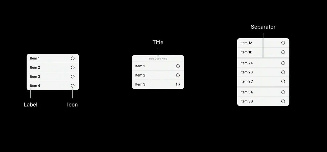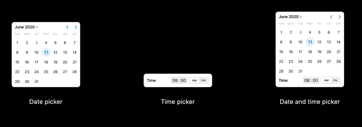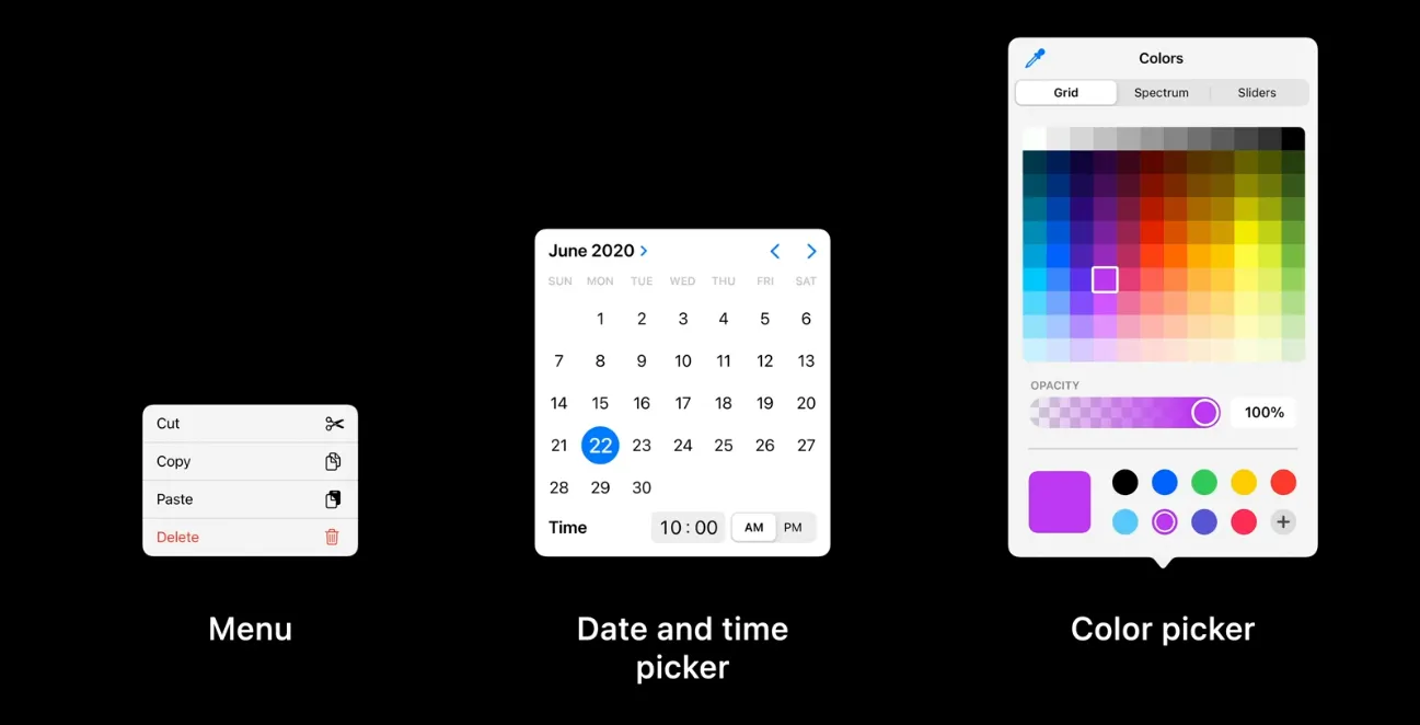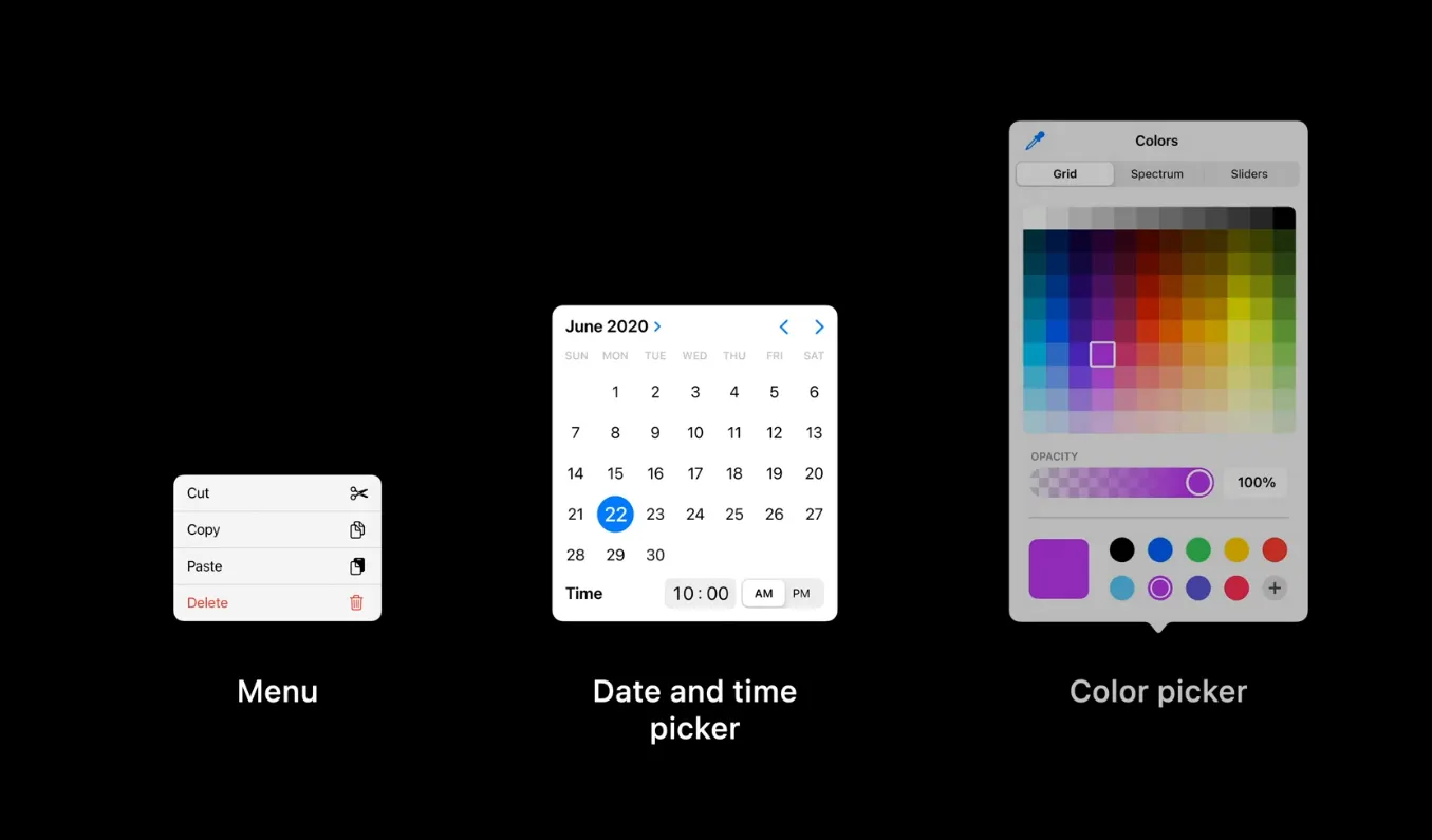 iOS14에서 3가지 컴포넌트가 추가되었습니다. 아이폰과 아이패드에서 사용가능하고 3가지는 메뉴, 타임피커, 컬러피커 입니다.