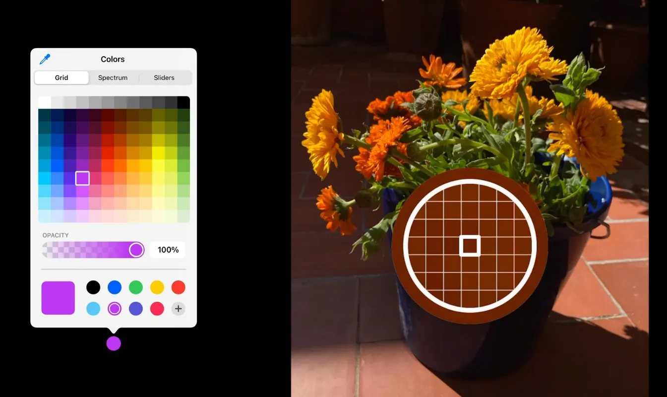 왼쪽 상단의 피커 버튼으로 확대경을 통해 색상을 선택하여 화면의 보이는 색상을 가져올수 있습니다.