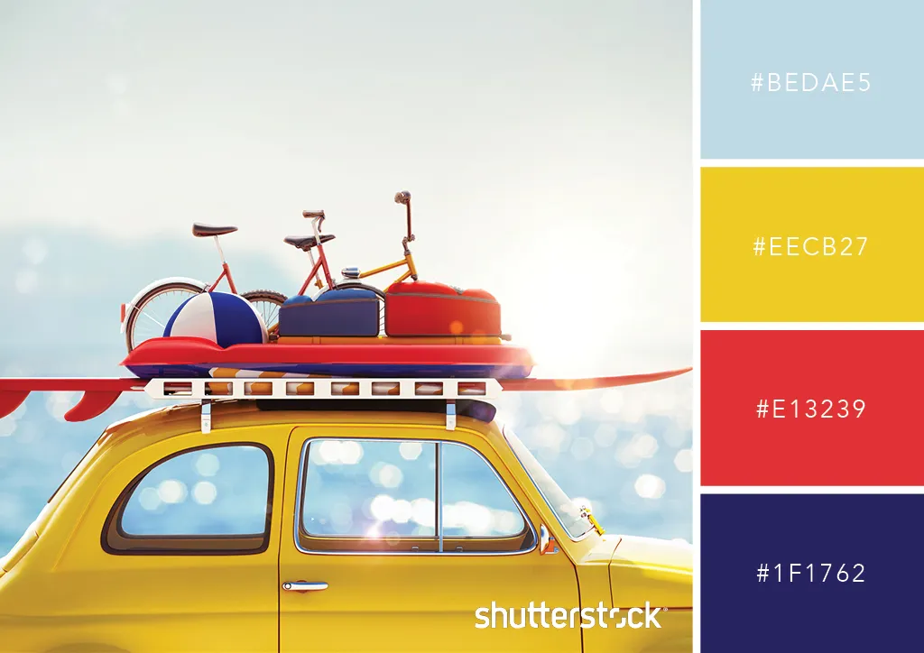 노란색, 파란색, 빨간색은 균형을 맞추기가 어려운 역동적인 3색 조화를 형성합니다. 아래 자동차의 노란색과 같이 한 가지 색상을 두드러지게 하고 차 위의 물놀이용품처럼 파란색과 빨간색 같은 다른 2가지 3색 조화의 색상으로 강조합니다.