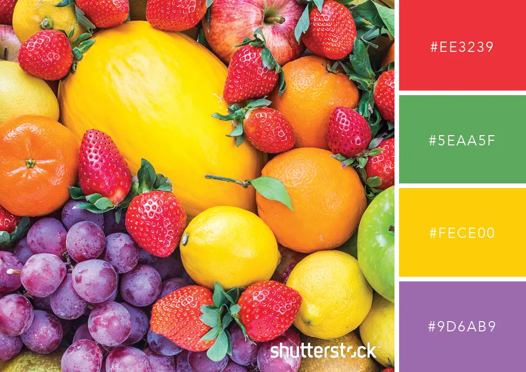 보색을 짝지어 사용하면 아래에서 보이는 것과 같이 컴포지션에 대비와 시각적 강도를 높일 수 있습니다. 주황색 감귤류 과일의 선명함이 하늘색 배경을 바탕으로 두드러집니다.