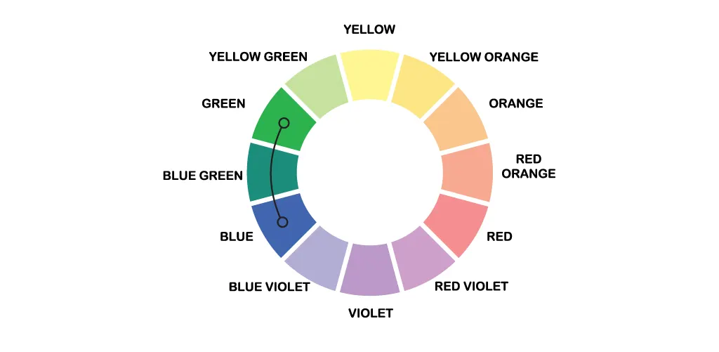 이 색채 배합은 보색 배합과 비슷한 시각적인 느낌을 주지만 대비 강도는 그보다 약합니다. 유사색을 사용하면 보색의 뚜렷한 대비를 부드럽게 만들 수 있습니다.