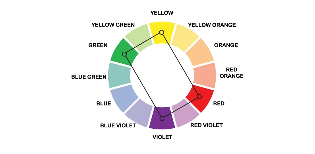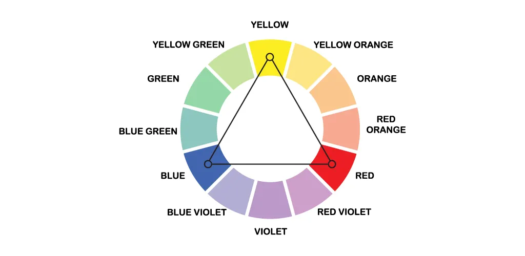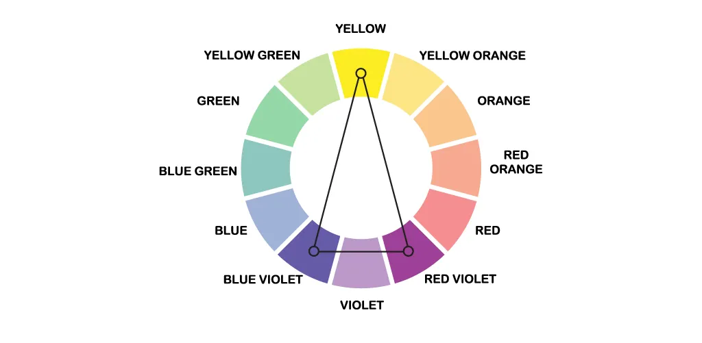 3색 조화는 아래에서 볼 수 있는 것처럼 색상환에서 정삼각형을 형성하면서 서로 등거리에 있는 3가지 색상으로 구성됩니다. 3색 조화는 원색, 2차 색상, 3차 색상의 3가지 색상을 포함할 수 있습니다.
