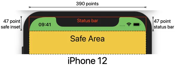 아이폰 12는 47의 safe area Inset과 47의 status bar 높이를 가지고 있습니다.