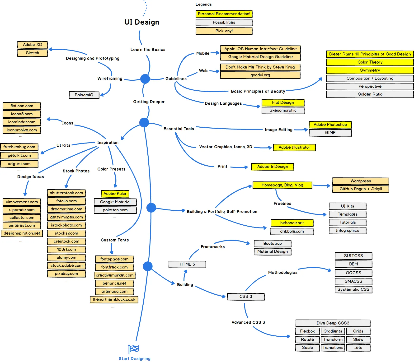 UI디자인의 로드맵을 살펴보자니 대부분이 툴에 치중되어있는 모습이 보입니다. 그중에서 필수 요소라고 표시되어있는 노란색들만 먼저 살펴보자면